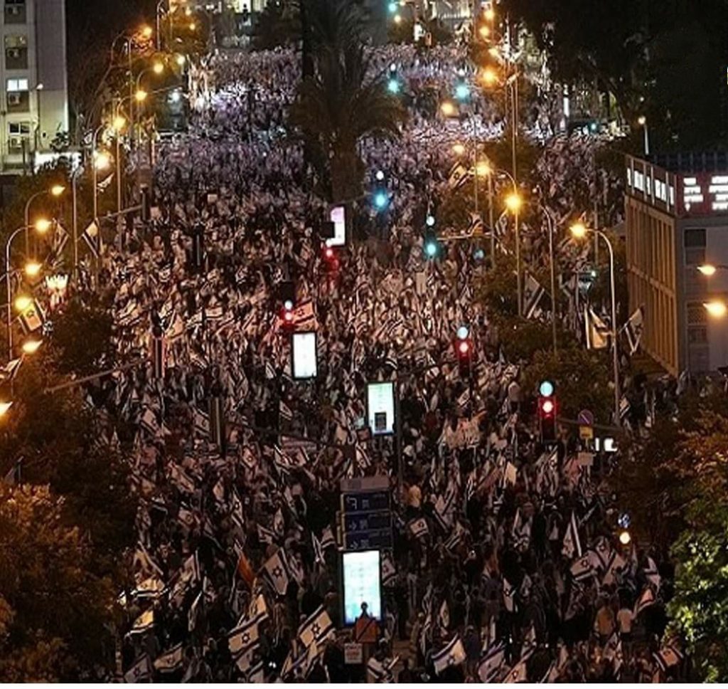 وتظاهر الآلاف عند مفترق “حوريف” في مدينة “حيفا” شمالا، وعند مفترق “كركور” قرب “الخضيرة”، ونظمت تظاهرة احتجاجية ضد خطة إضعاف القضاء لأول مرة في “الرملة”، كما نظمت تظاهرات مماثلة في عدة مدن وبلدات ومفترقات طرق.