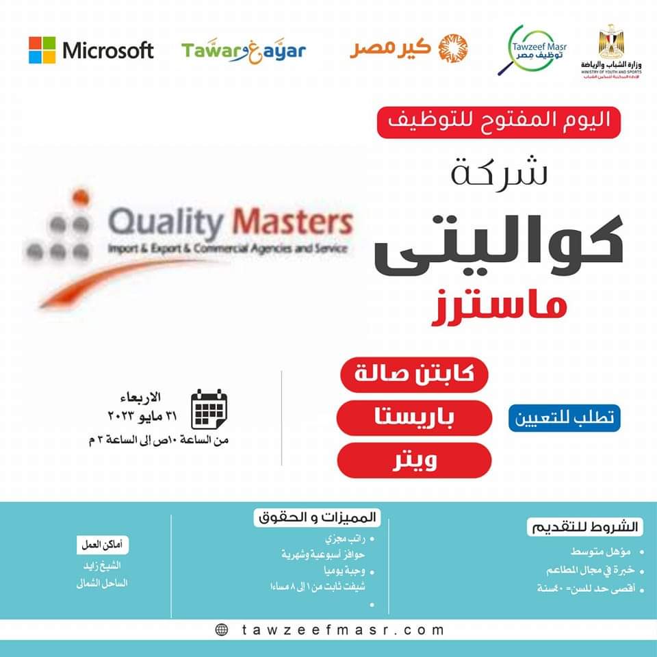 تعلن وزارة الشباب والرياضة الإدارة عن اليوم التوظيفي المفتوح لشركة كواليتي ماستر