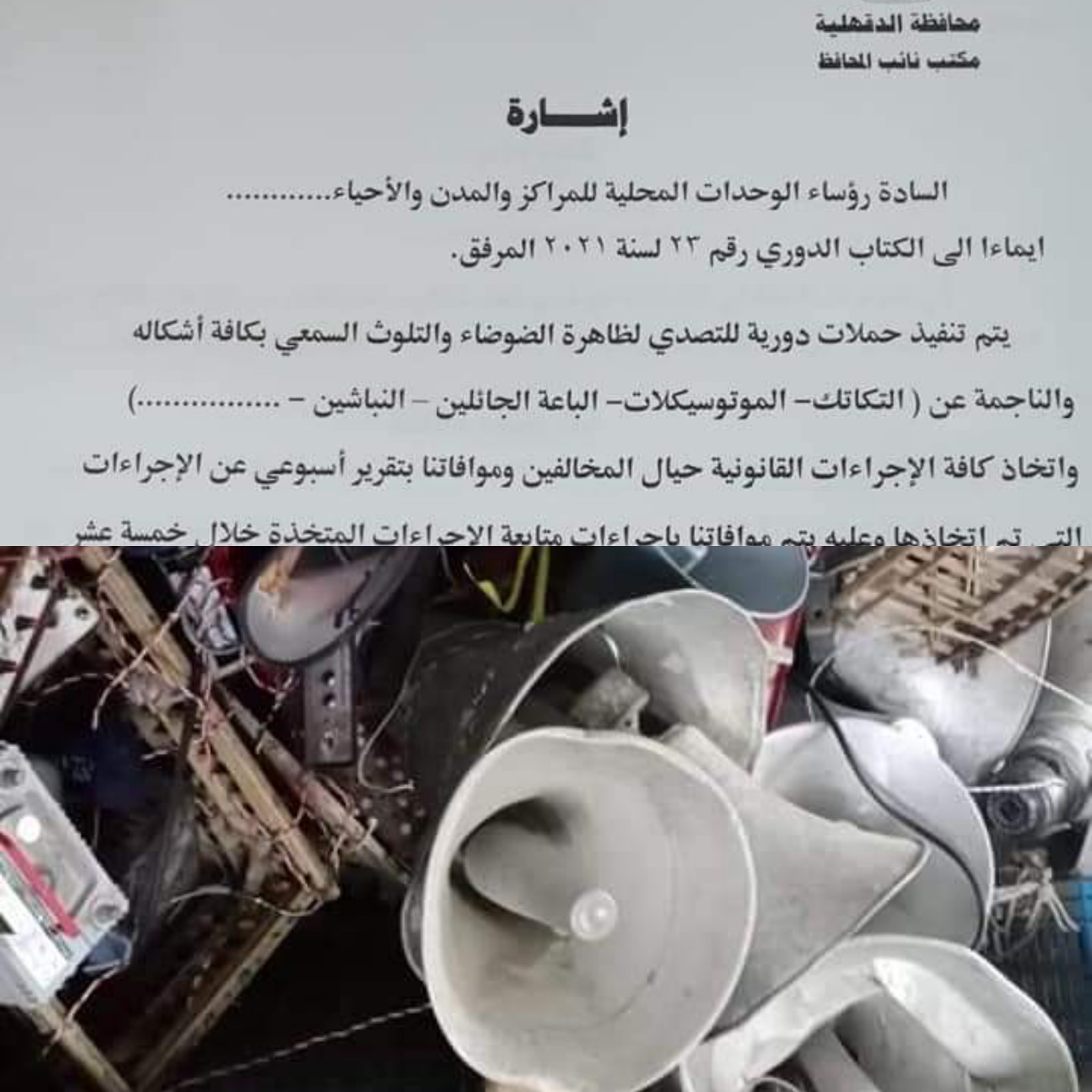 تابع محافظ الدقهلية جهود و أعمال الوحدات المحلية للمراكز والمدن والأحياء فى تحقيق إنضباط مركبات التوك توك بالشورع بالمدن والقري بنطاق المحافظة ومصادرة مكبرات الصوت بها
