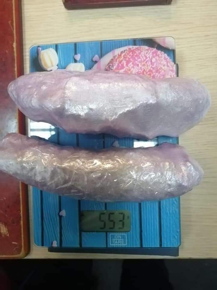 وتم استدعاء الشرطية هيام عمر لتفتيشها ذاتيا فتبين وجود 2 لفافة كبيره الحجم بين تم لصقها على جسمها بداخلها 550 جرام من مسحوق وحصوات لونها كريستالي وبيج يشتبه أن تكون من ماده “MDMA ” إكستازى المخدرة .