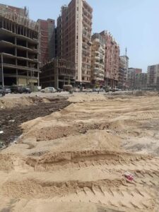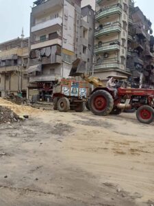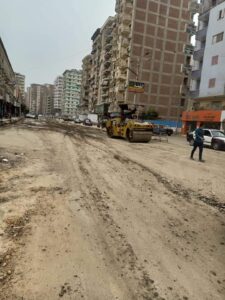 وجاري أعمال الدمك لجزء اخر لتجهيز فرمه والتكسير وإزالة المخلفات في باقي الشارع