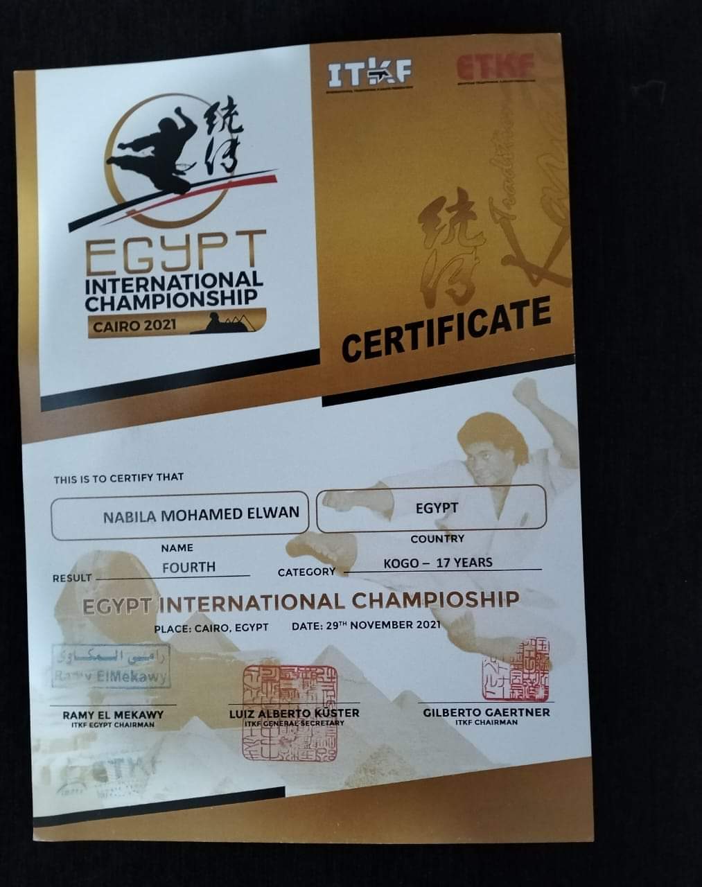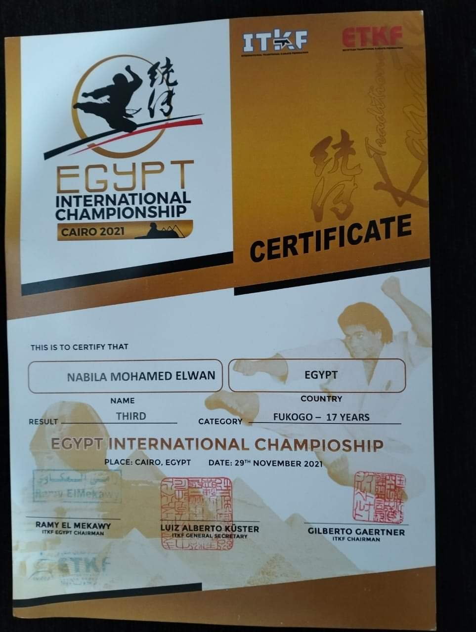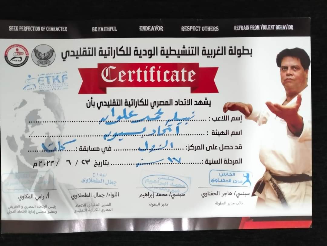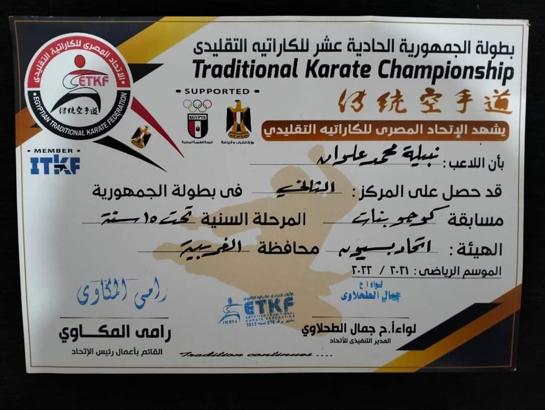 وذالك لحصولها علي المركز الثاني ببطوله الجمهوريه للكاراتيه التقليدي في مسابقه الكوجو و المركز الثالث في مسابقه الفوكوجو في بطوله مصر الدوليه للكاراتيه التقليدي و الثالث في الكوجو في مسابقه مصر الدوليه للكاراتيه التقليدي و المركز الاول في مسابقه الغربيه التنشيطيه للكاراتيه التقليدي لاعبة منتخب مصر سابقا