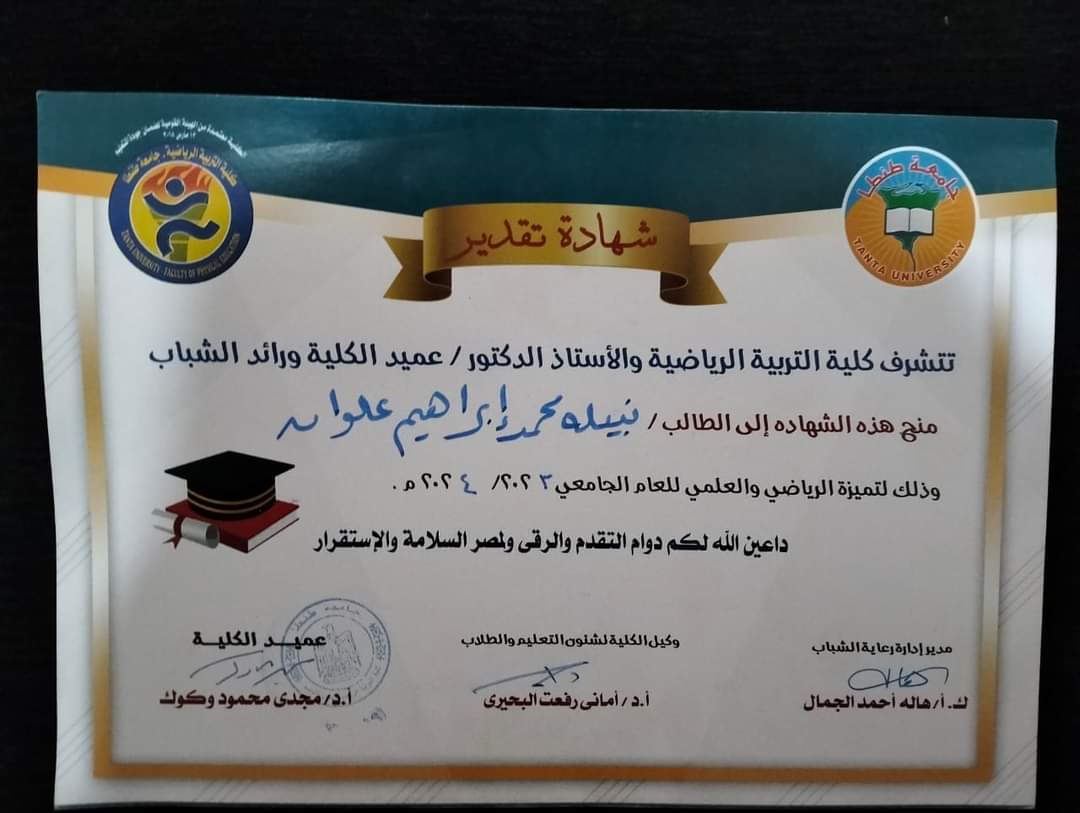 وان أبعث برقيه تهنئه بالتوفيق الي الطالبه / نبيلة محمد علوان السن ٢٠ عام طالبة في الفرقة الثانية كلية التربية الرياضية جامعة طنطا محافظه الغربية
