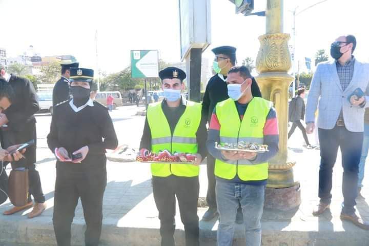 توزيع رجال الشرطة الحلوى والورود والأعلام على المواطنين والمارة بكفر الشيخ