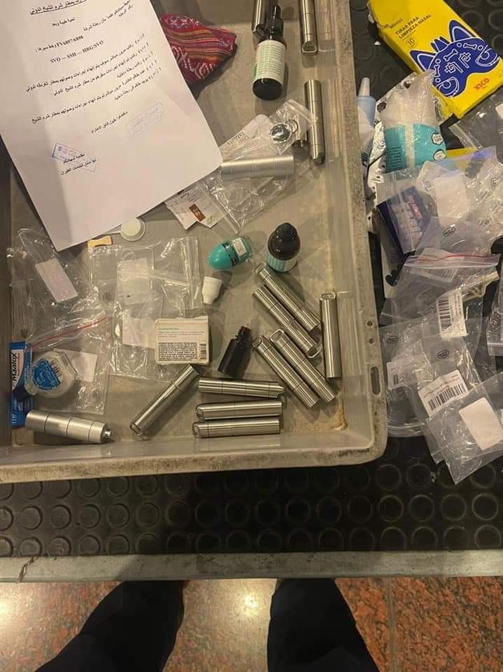 وبالعرض على جابر موسى نائب مدير الجمرك قام بتكليف هيثم خلف تحت إشراف مهند سامى مدير الحركه لتفتيش أمتعة الراكب فتم العثور على خمسه عشر قرص من الاستكازى المخدر وزجاجه بها زيت المرجوانا المخدر بين طيات الملابس .