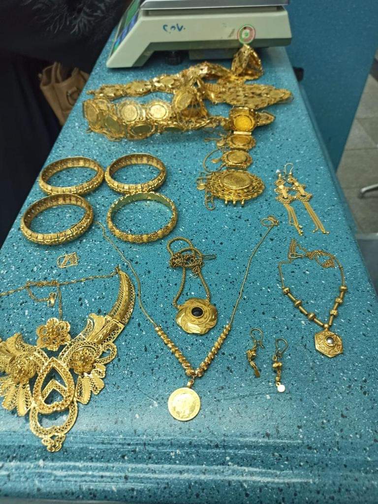 وبتفتيش حقائبها على جهاز الفحص بالأشعة تلاحظ وجود كثافات معدنية في حقيبة يد الراكبة، وبتفتيش حقائب الراكبة يدويا تم ضبط 14 قطعة متنوعة من المشغولات الذهبية بوزن 800 جرام، وبتفتيش الراكبة ذاتيا فوجدت كمية أخرى تقارب الـ 200 جرام ترتديها الراكبة تم منحها إياهم كونها ذهبها الشخصي الذي ترتديه.