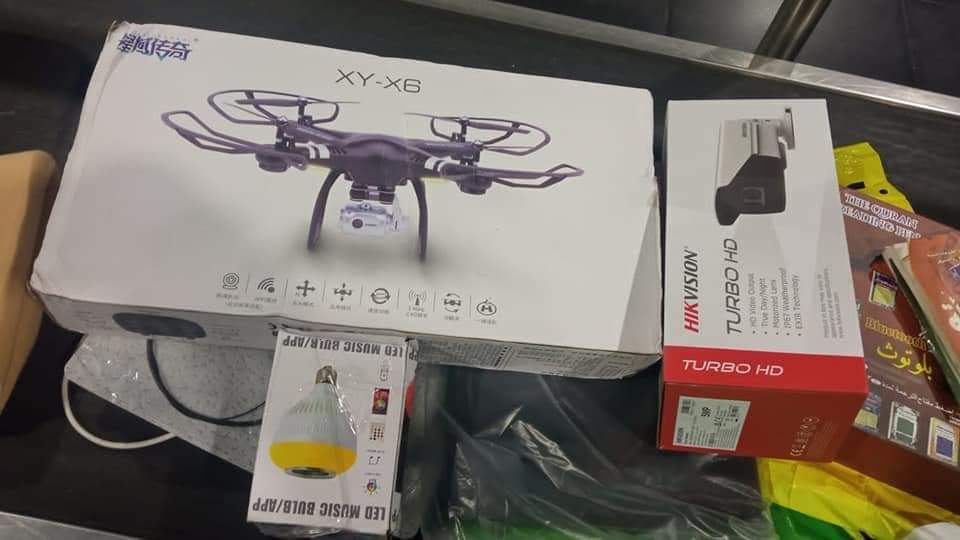 وبالعرض علي حسن حمدي مدير الحركه قام بتكليف محمود سيد طه رئيس القسم بتفتيش حقائب الراكب فتبين وجود طائرة دورون مرقوم عليه XY-X6 و3 ساعات مزودة بكاميرا و2جهاز لاسلكي وجهاز رؤية ليلية و2 كاميرا مراقبه .
