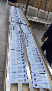 وبالعرض على أحمد نبيل مدير الحركة والمشرف على الصالة الخضراء قام بتكليف أحمد عبدالله مأمور الجمرك بتفتيش حقائب الراكبة فعثر على لفائف بين طيات الملابس تحتوى على 135 من الأمبولات الخاصة بزراعة الخلايا الجذعية والأنسجة البشرية .