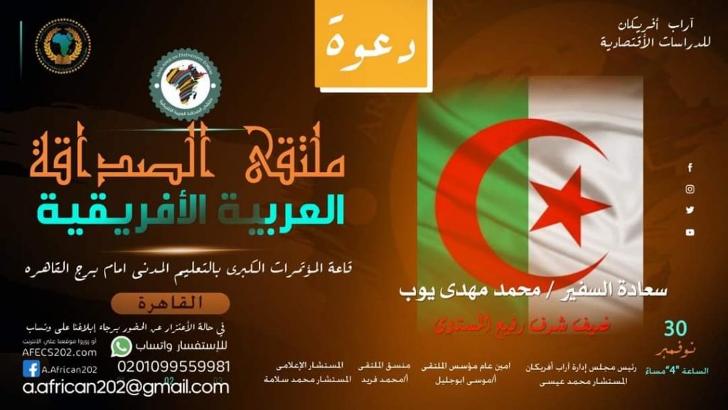 من أجل تنمية وتعزيز العلاقات بين الشعوب العربية والإفريقية تم تأسيس ملتقى الصداقة العربية الأفريقية والمقام تحت شعار “نتعارف ونتعاون”، والذي سوف يشارك به السفير/محمد مهدي أيوب، القائم بأعمال سفارة جمهورية الجزائر بالقاهرة.