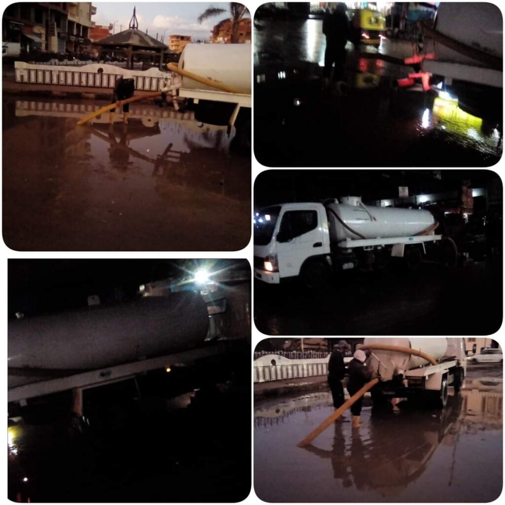 إنتشار كامل لكافة المعدات والأطقم بشوارع وميادين مدن وقرى المحافظة للحد من الآثار الناجمة ورفع التراكمات بالتنسيق بين فرق وأطقم الأزمات والحماية المدنية وشركة المياة وكافة الجهات المعنية .