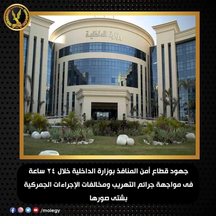 أسفرت جهود الإدارات العامة التابعة لقطاع أمن المنافذ بوزارة الداخلية بالتنسيق مع كافة الجهات المعنية خلال 24 ساعة عن تحقيق العديد من النتائج الإيجابية .. أبرزها الآتى:-