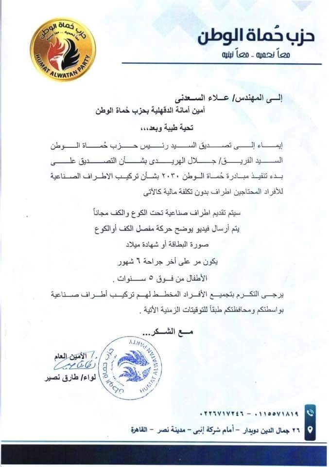 —والمح القرار الصادر بحزب حماة الوطن بصرورةًالتوجه لتجميع الافراد المخطط لهم تركيب اطراف صناعيه عن طريق الامانه الحزبيه لحزب حماة الوطن في الدقهليه