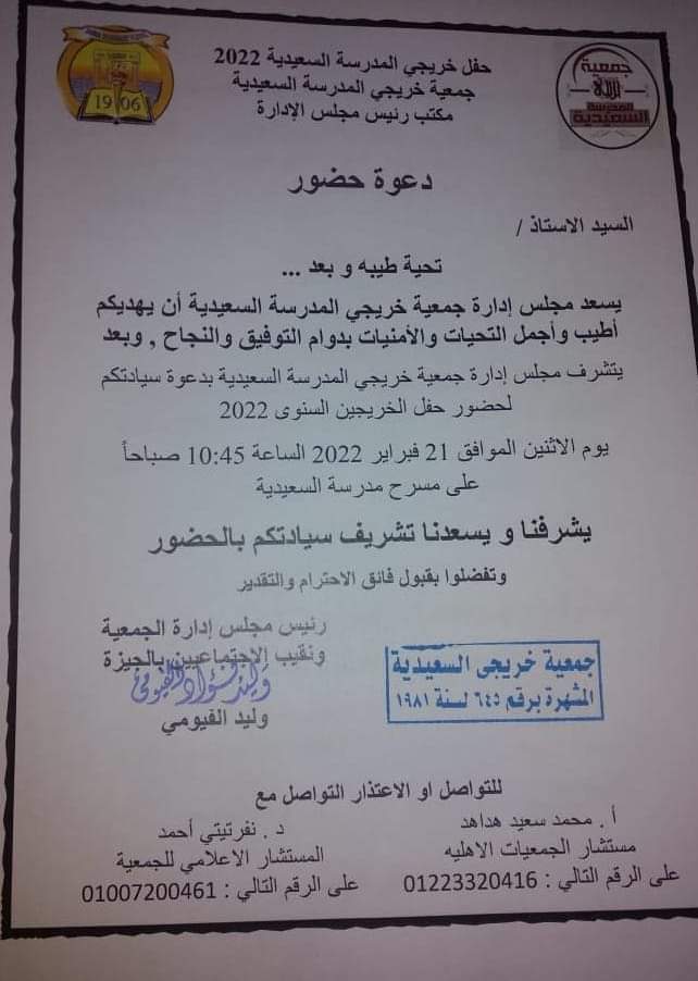 تقيم مدرسة السعيدية بالجيزة حفلها السنوى الاثنين 21 فبراير 2022 برئاسة السيد وليد الفيومي رئيس مجلس إدارة الجمعية ونقيب الاجتماعيين بالجيزة وبالتعاون مع مديرية التربية والتعليم بالجيزة تحت رعاية السيد الاستاذ أشرف سلومة وكيل وزارة التربية والتعليم بالجيزة الذي ساندنا كثيراً بالاضافة للمجهود العظيم الذي قامت به قيادات المديرية المختلفة والذين ساهموا معنا فى إخراج ذلك الحفل بالشكل الرائع والذي يليق بإسم السعيدية هذا الصرح العظيم و بخريجي وطلاب وإدارة مدرسة السعيدية ولن ننسى ايضاً مجهود مجلس أمناء وأباء الجيزة برئاسة المستشار بدوي علام بالتعاون معنا لإقامة حفلنا السنوي وقام أعضاء مجلس إدارة الجمعية بمجهود عظيم بالتواصل مع الكثيرين من الخريجين حتى وصلنا لخريجي دفعة 52 ليحضر الحفل خريجيين من أكثر من خمسون عاماً