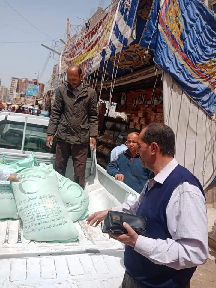 ، حيث تم التحفظ علي عدد 1200 كيس بإجمالي طن و 200 كجم ، كما تم ضبط 3 من أصحاب محال الأغذية وذلك لعدم إعلانهم عن أسعار السلع الغذائية