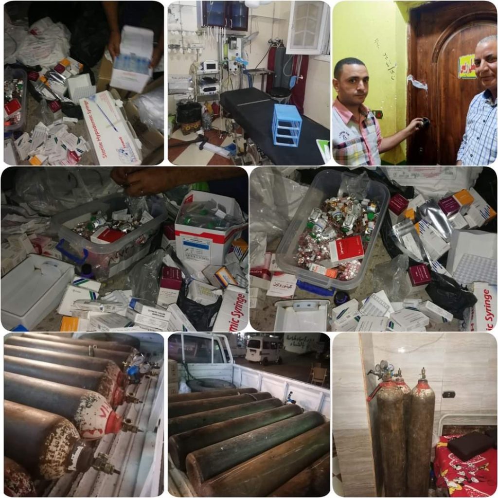 ضبط عيادة بها تخصصات نساء وتوليد وأنف وأذن وحنجرة تدار بدون ترخيص وبها غرفة عمليات وتم ضبط، 7أسطوانات أكسجين ممتلئة داخل غرفة العمليات وكميات كبيرة من المحاليل والسرنجات مختلفة المقاسات والأنابيب حنجرية وكميات كبيرة من الأمبولات مسكنات وتخدير وجاري الحصر والفحص من قبل المختصين بالإدارة الصحية بالدلنجات وتم تحرير محضر بالواقعة، وتشميع العيادة بالشمع الأحمر .