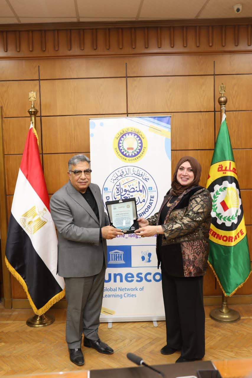 للأستاذة/ هانم التهامي مدير إدارة التعاون الدولي بمحافظة الدقهلية وقائد الفريق المسؤول عن إعداد ملف انضمام مدينة المنصورة لعضوية شبكة اليونسكو العالمية لمدن التعلم، على هذا الإنجاز الوطني المشرف الذي يُجسد أعلى معايير الكفاءة المهنية، وحسن القيادة، والعمل المؤسسي المتكامل..