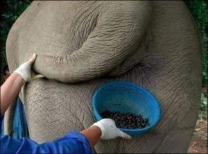 تبدأ عملية الإنتاج بتوفير حبوب البن مع خليط قطع الفاكهة من الكرز تحديداً للفيلة التي تبدأ بالتهامها، وينتظرون خروج الحبوب بعد ثلاثة أيام بعد مرورها بالجهاز الهضمي للفيلة،