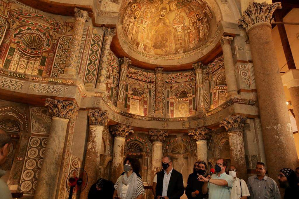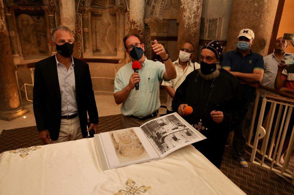 وذكرت السفارة الأمريكية – في بيان صحفي – أن قيادة الكنيسة استقبلت السفير جوناثان كوهين لدى وصوله إلى الدير الأحمر ثم بدأ زيارته للموقع حيث شاهد اللوحات الجدارية للكنيسة، والتي تم تنظيفها وترميمها من قبل مركز الأبحاث الأمريكي في مصر (ARCE) بتمويل من الحكومة الأمريكية بقيمة 3.6 مليون دولار عن طريق الوكالة الأمريكية للتنمية الدولية (USAID).