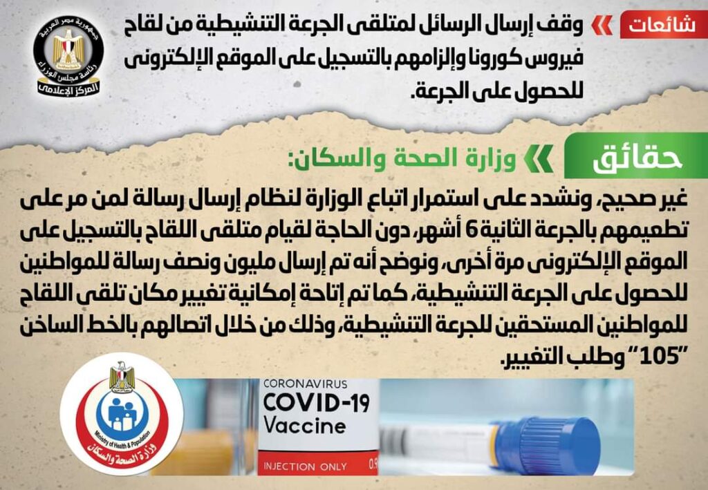 تداولت بعض المواقع الإلكترونية وصفحات التواصل الاجتماعي أنباء بشأن وقف إرسال الرسائل لمتلقي الجرعة التنشيطية من لقاح فيروس كورونا وإلزامهم بالتسجيل على الموقع الإلكتروني للحصول على الجرعة، وقد قام المركز الإعلامي لمجلس الوزراء بالتواصل مع وزارة الصحة والسكان.