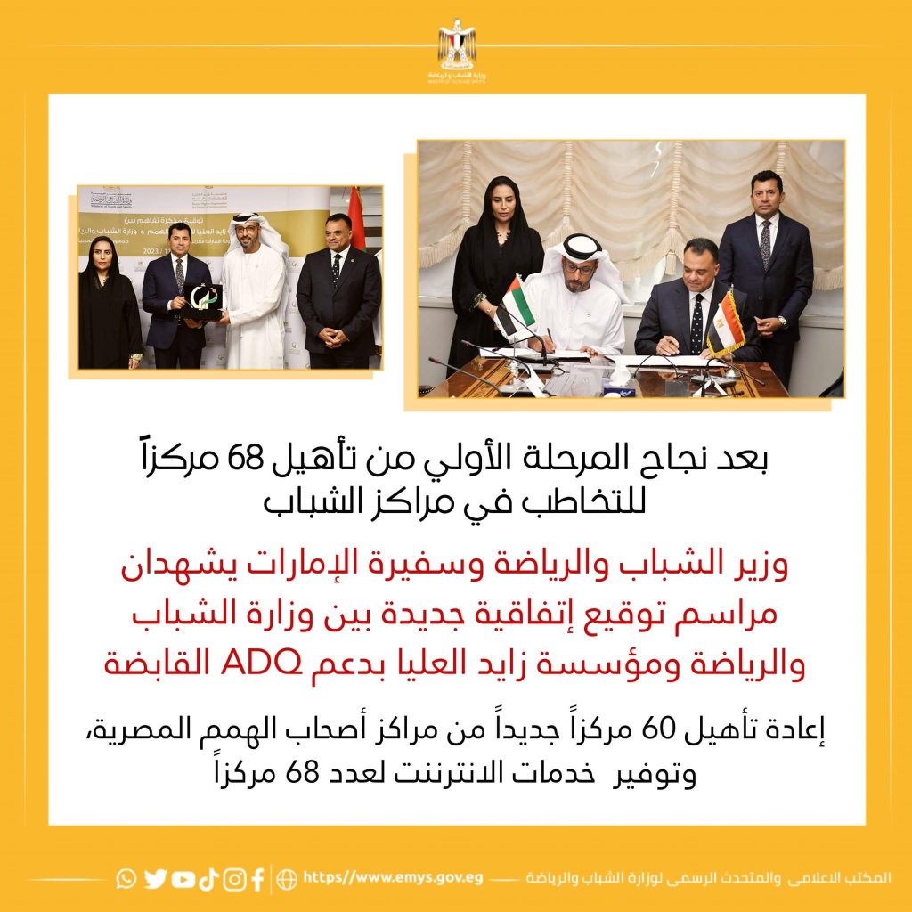 صبحي وسفيرة الإمارات يشهدان مراسم توقيع إتفاقية جديدة بين وزارة الشباب ومؤسسة زايد العليا بدعم ADQ القابضة