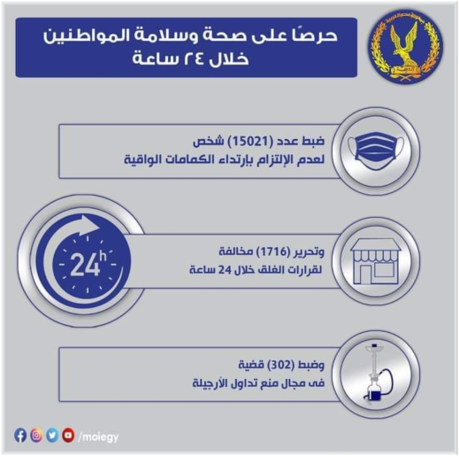 تم ضبط عدد 15021شخص لعدم ارتدائهم الكمامات الواقيه