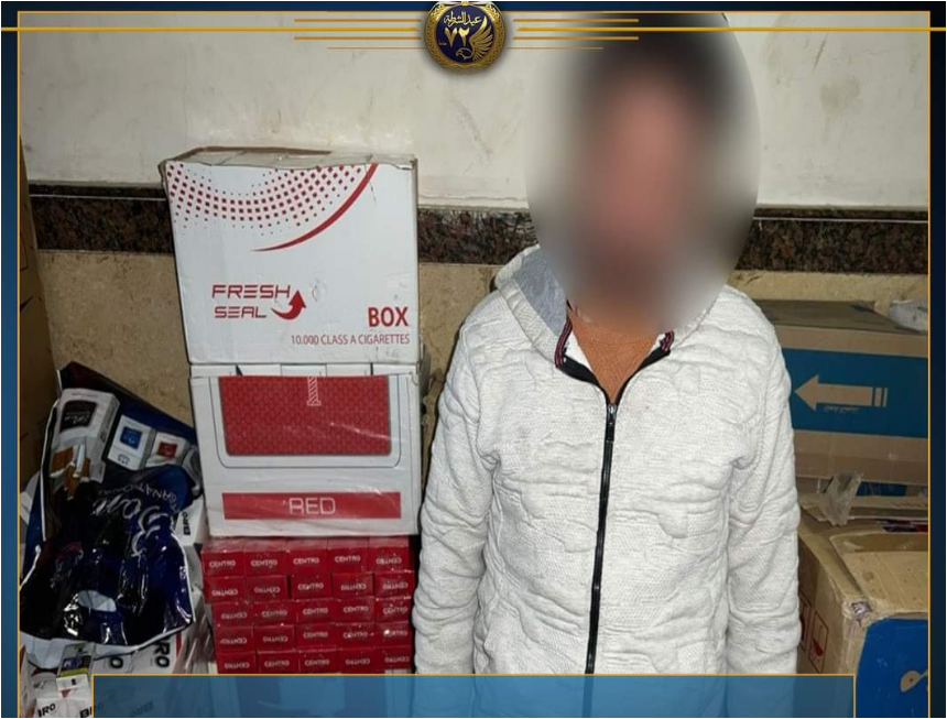 وبحوزته (2174 قاروصة سجائر مختلفة الأنواع “مجهولة المصدر” بإجمالى 21740 عبوة سجائر) مُهربة جمركياً.