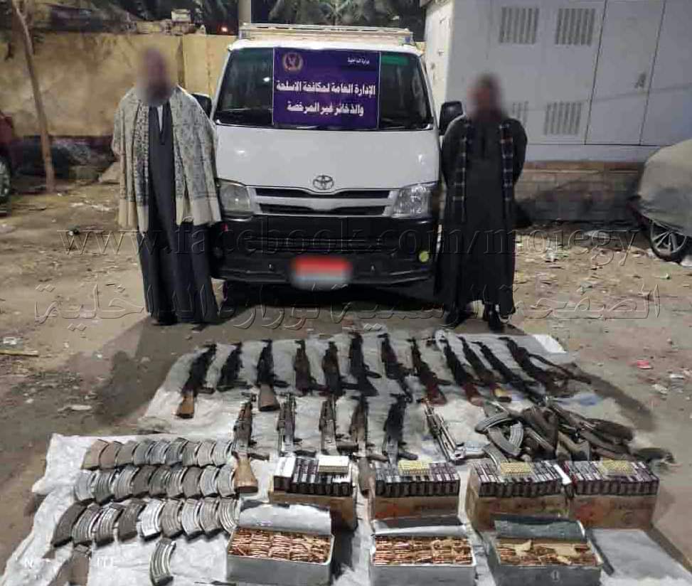 فى إطار جهود أجهزة وزارة الداخلية لمكافحة الجريمة بشتى صورها لا سيما جرائم حيازة الأسلحة النارية غير المرخصة وتهريبها والإتجار فيها .. فقد تمكنت الإدارة العامة لمكافحة الأسلحة والذخائر غير المرخصة بقطاع مكافحة المخدرات والجريمة المنظمة بالتنسيق مع قطاعات الأمن العام والأمن الوطنى والأمن المركزى والإدارة العامة لتكنولوجيا المعلومات ومديرية أمن المنيا عقب تقنين الإجراءات من ضبط (عدد 44 بندقية آلية – عدد 5 طبنجة – عدد 170 خزينة فارغة – 13250 طلقة نارية مختلفة الأعيرة – 4 هاتف محمول – مبلغ مالى) بحوزة ثلاثة أشخاص ، وذلك فى كمين أعد خصيصاً لضبطهم حال إستقلالهم سيارتين بالمنيا .