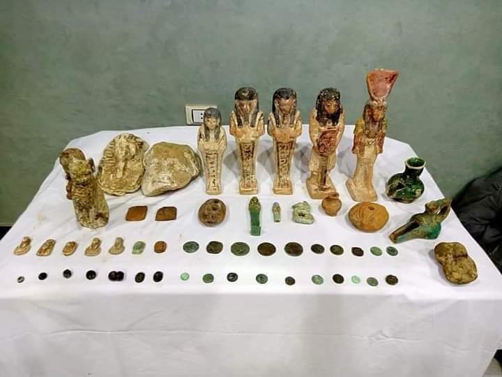 سيد ع ص والمقيم بقرية مير دائرة مركز القوصية بعدد 54 قطعه اثريه بمسكنة، تم العثور عليهم داخل حفر مستطيل الشكل بعمق 5م تقريباوادوات الحفر