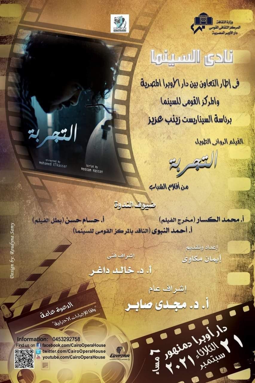 هذا وقد صرحت م إيمان مكاوي – مدير دار أوبرا أنه وفى إطار التعاون بين دار الأوبرا المصرية برئاسة الدكتور مجدي صابر والمركز القومي للسينما، فسوف يعرض نادي سينما أوبرا دمنهور فيلم روائي من أفلام الشباب من إنتاج 2020 م بعنوان “التجربة” في الساعة السادسة مساء يوم الثلاثاء 21سبتمبر وذلك بحضور مخرج الفيلم محمد الكسار، وبطل الفيلم ومؤلفه حسام حسن، والناقد السينمائي أحمد النبوي بالمركز القومي للسينما .