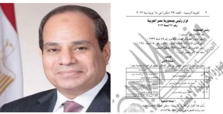 وكان قد أصدر الرئيس عبدالفتاح السيسي قرارًا رقم 260 لسنة 2022 اليوم الخميس، بالعفو عن عقوبة السجن المقضي بها على المحكوم عليهم، سعيد عطية إبراهيم، ومحمد عيد الغريب، ومحمد مرسي محمد مرسي، ونُشر القرار في الجريدة الرسمية.