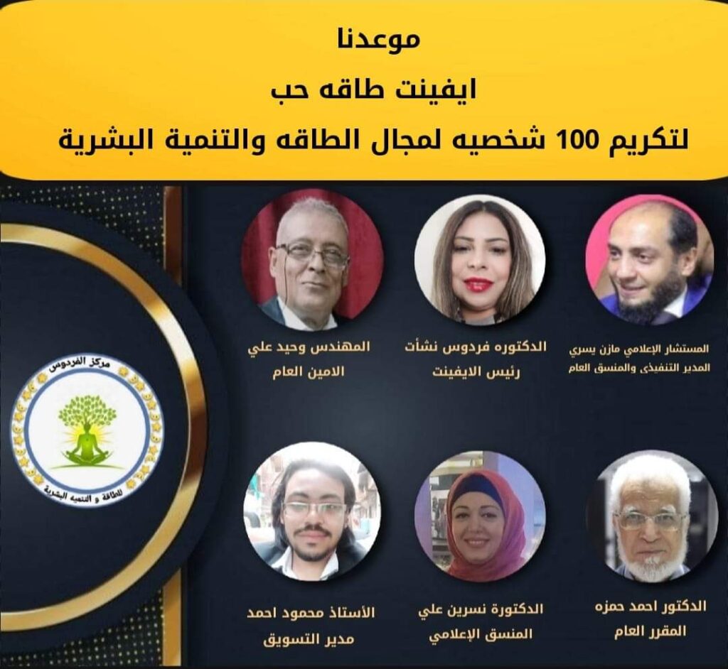 لذالك تم التنسيق من قبل مؤسسه الفردوس للطاقه والتنمية البشرية لعقد ايفينت طاقة حب فى القاهرة تحديدا فى شهر فبراير ،وقد صرحت الدكتوره فردوس نشأت رئيس مجلس ادارة الفردوس للطاقه والتنميه البشريه ورئيس ايفينت طاقه حب انه سيتم تناول موضوع الطاقه الحيويه من زوايا مختلفه .