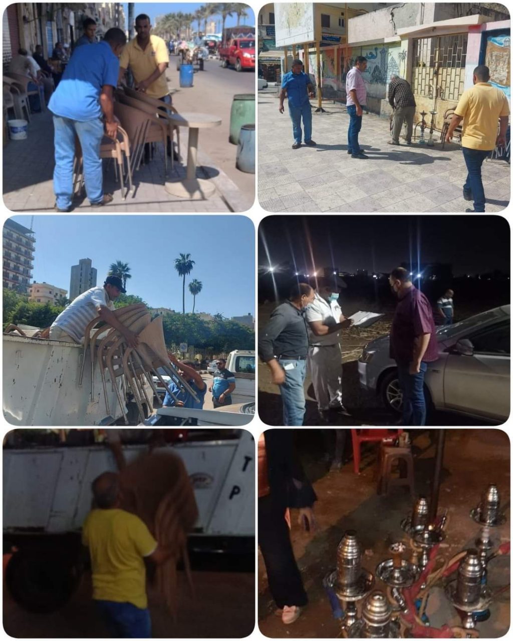 أسفرت الحملات التى نفذتها الوحدات المحلية بمدن ومراكز المحافظة عن غلق 7 محلات مخالفة وإعدام ومصادرة 29 شيشة وتحرير 25 محضر عدم إرتداء كمامة والتى تمثلت فى :-