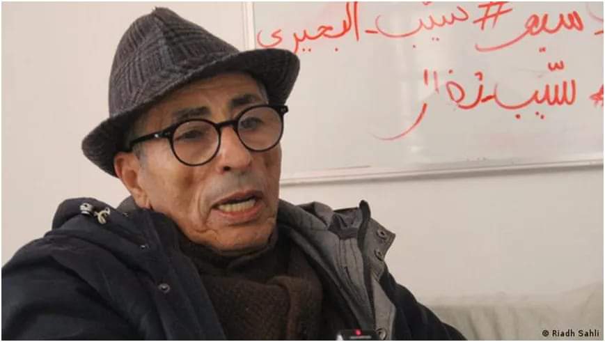 عز الدين الحزقى مناضل مخضرم، قاوم الإستبداد فى عهدى بورقيبة وبن على. تحيط بجدران مقر إضراب الجوع المفتوح شعارات ولافتات معارضة لسلطة الرئيس قيس وقرارات 25 يوليو 2021.