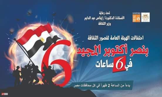 برعاية الفنانة الدكتورة إيناس عبد الدايم وزير الثقافة، تحتفل الهيئة العامة لقصور الثقافة برئاسة الفنان هشام عطوة، بالذكرى الثامنة والأربعين لانتصارات حرب أكتوبر المجيدة، حيث تقدم الهيئة برنامجًا مكثفًا يوم الأربعاء الموافق 6 أكتوبر بعنوان “في 6 ساعات”، تقدم خلاله أنشطة وفعاليات ثقافية وفنية متنوعة، تنطلق جميعها في توقيت واحد من الثانية ظهرًا وحتى الثامنة مساءً، وتنفذ خلالها الهيئة أكثر من 350 نشاطا فنيًّا وثقافيًّا بفروعها ومواقعها الثقافية في كل المحافظات احتفالا بذكرى النصر الخالد، بخلاف برنامج احتفالات يمتد طوال شهر أكتوبر.