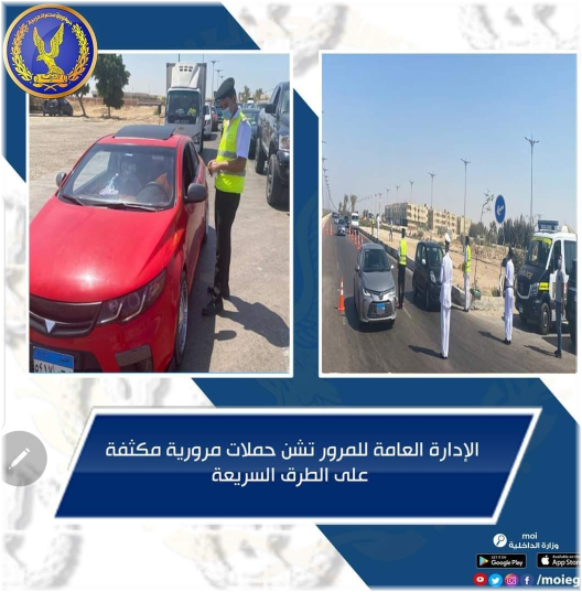 قامت الإدارة العامة للمرور بشن حملات مرورية مكثفة على الطرق السريعة شملت طرق (الإسكندرية الصحراوى – العلمين الصحراوى – الساحل الشمالى) ،