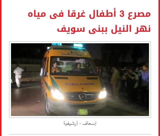 لقى 3 أطفال بينهم شقيقين مصرعهم غرقًا بمحافظة بنى سويف، إثر سقوطهم فى بركة مياه عميقة بطرح نهر النيل، أثناء لهوهم بالقرب من الأرض الزراعية بقرية الشناوية بمركز ناصر شمال المحافظة.
