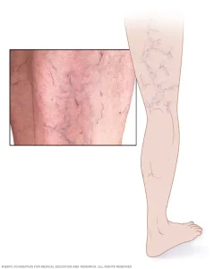 مثل جلطات الدم، ويُوجد خيارات علاج متعددة سواء الأدوية والجوارب أو الليزر أو الجراحة
