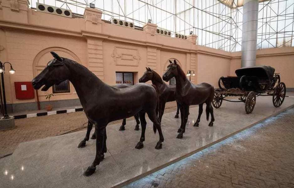 يضم المتحف ست قاعات للعرض، وهي قاعة “الأنتيكخانة” التي ستعرض العربات والمركبات المُهداة إلى الأسرة العلوية خلال المناسبات المختلفة، وقاعة “الاستقبال”، وبها شاشة عرض سينمائي لعرض فيلم وثائقي عن الفترة الزمنية للأسرة العلوية، وقاعة “كبار الزوار”، والتي تضم عدداً من المقتنيات النادرة الخاصة بالخديوي إسماعيل، والأسرة العلوية، منها صالون، ومكتب أثري، وبيانولا، وغرامافون، ومجموعة من اللوحات الزيتية، وصور فوتوغرافية أثناء الصيد، وقاعة “الاحتفالات” التي تعرض أندر أنواع المركبات، وقاعة “المناسبات الملكية” حيث تضم مجموعة من العربات التي كان يستخدمها أفراد تلك العائلة في المناسبات الملكية، وقاعة “الحصان”، وتُعرض فيها الملابس الخاصة بالعاملين على العربات الملكية والإكسسوارات الخاصة بالخيول، بالإضافة إلى نافورة لا تزال تعمل إلى اليوم.