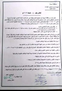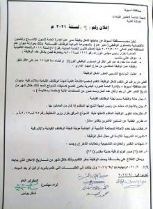 والإشرافية فضلاً عن الدورات التدريبية اللازمة في مجال شغل الوظيفة وشهادات التقدير والعلاوات التشجيعية وخطابات الشكر إن وجدت كذا عدد 6 صور فوتوغرافية حديثة مقاس (4×6) لافتاً إلى عدم الالتفات للطلبات التي تقدم بالبريد أو قبل أو بعد الميعاد المحدد “خلال شهر من تاريخ الاعلان” الذي يبدأ من اليوم 19 سبتمبر ونهايتة 18 أكتوبر القادم.