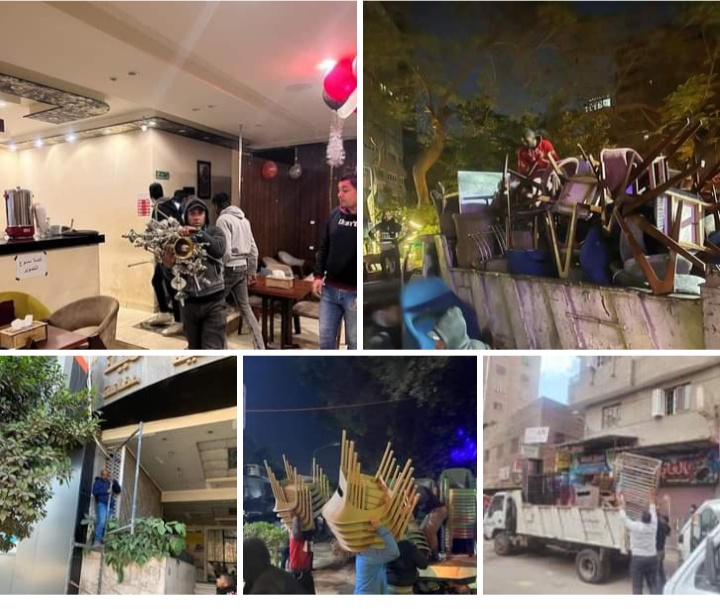 كما تم مصادرة الشيش من الكافيتريات و المقاهى بمنطقة الاعلام و عمارات البترول و شرق الترسانة وشارع عبد المنعم سند بالاضافة الى اتخاذ كافة الاجراءات القانونية و مصادرة البطاقات حيال المحال التجارية المخالفة لمواعيد الغلق و ذلك خلال الحملة الليلية كما تم تمشيط شارع النيل و ازالة كافة التعديات من الباعة الجائلين نطاق حى العجوزة