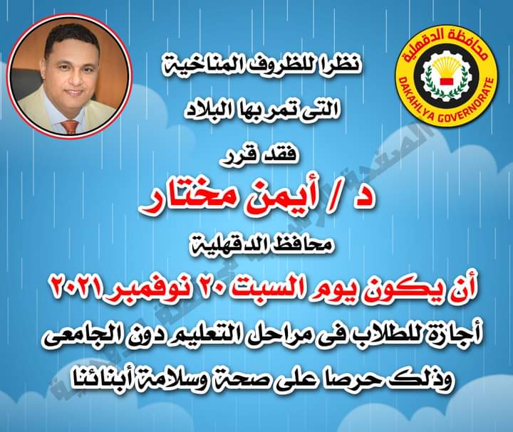 أعلن الدكتور أيمن مختار محافظ الدقهلية تعطيل الدراسة السبت المقبل بجميع المدارس الواقعة بنطاق المحافظة، وذلك نظرًا لتوقعات هيئة الأرصاد الجوية بتعرض البلاد لموجة من الطقس السيئ.