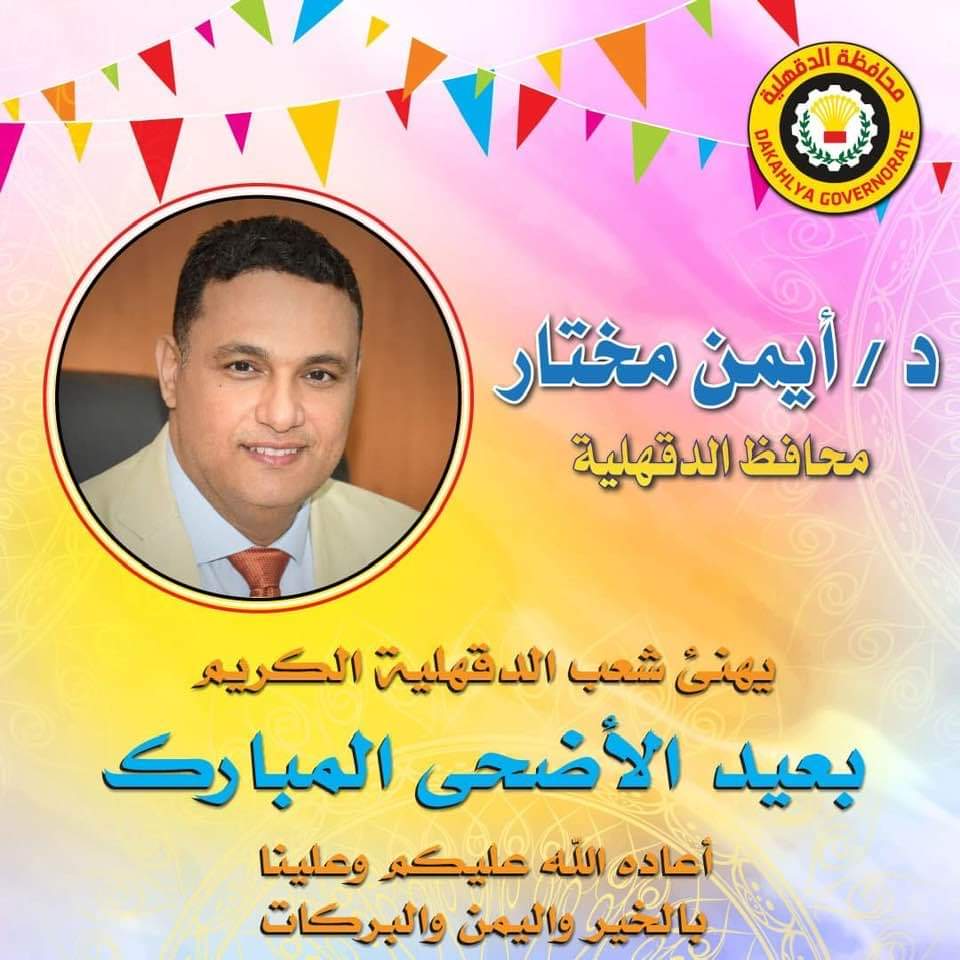 ”يسعدني ويشرفني ان اتقدم بخالص التهنئه القلبيه لابناء ومواطني محافظةً الدقهليه ولجميع القيادات بالجهاز التنفيذي للمحافظه وجميع العاملين بالقطاعات الخدمية وقطاعات المرافق بنطاق محافظة الدقهليه وللشعب المصري الاصيل بمناسبة عيد الاضحي اعاده الله بالخير واليمن والبركات والسعاده والتوفيق لنحقق لمصرنا الغاليه المزيد من الرقي والتقدم والازدهار في ظل القياده الرشيده.