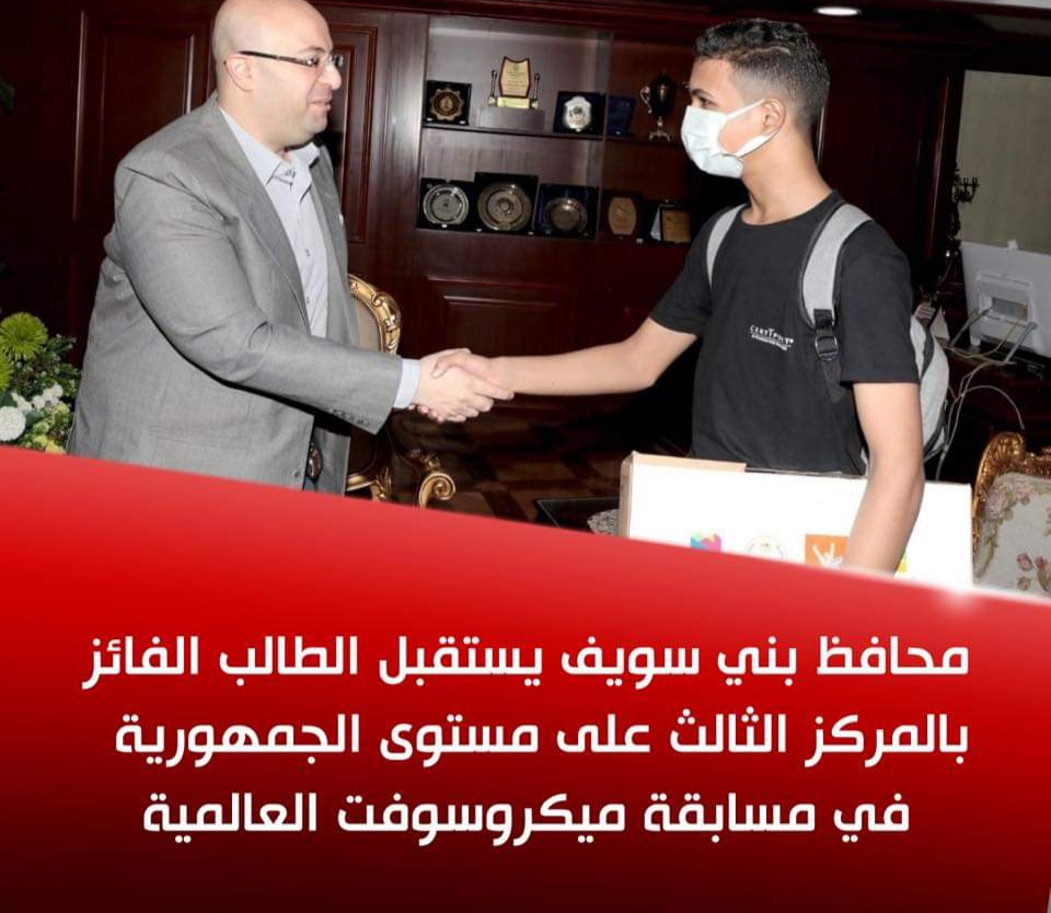 استقبل الدكتور محمد هاني غنيم محافظ بني سويف”بمكتبه اليوم” الطالب:عبد العظيم أحمد خيري “الصف الأول الثانوي بمدرسة نزلة البرقي بالفشن”الفائز بالمركز الثالث على مستوى الجمهورية في برنامج ميكروسوفت العالمية ضمن مسابقة أفضل 50 طالب على مستوى العالم في برنامج ميكروسوفت