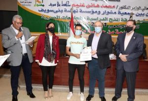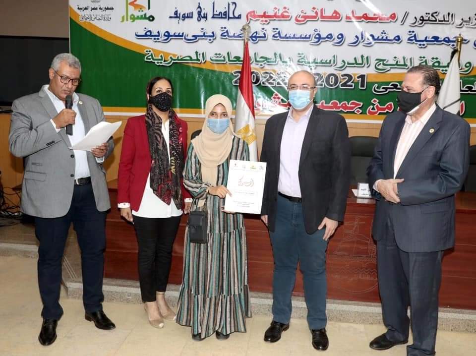 وسلم المحافظ الطلاب الفائزين وثيقة المنحة وقدم لهم التهنئة على تفوقهم وتميزهم العلمي والدراسي مما أهلهم للحصول على هذه المنحة لاستكمال دراستهم الجامعية ،معربا عن سعادته بالمشاركة في هذه الاحتفالية ، والتي تكتسب أهمية خاصة،حيث يستفيد منها الطلاب المتميزين والمتفوقين ومساعدتهم على استكمال تفوقهم،من خلال توفير الدعم المالي لاستكمال دراسته بالجامعة التي قد التحق بها ، موجها الشكر للقائمين على توفير المنحة من جمعية مشوار ومؤسسة نهضة بني سويف،مشيدا بدور مؤسسات المجتمع المدني التي تعتبر شريكاً أساسياً مع أجهزة الدولة في جهود التنمية وتحسين مستوى الخدمات وتوفير سبل العيش الكريم للمواطنين