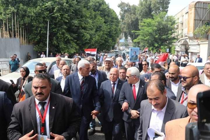 انطلق المعلمين المشاركين فى مؤتمر معلمى مصر يؤيدون الرئيس عبد الفتاح السيسى الترشح لفترة رئاسية جديدة الذى نظمته نقابة المهن التعليمية، فى مسيرة حاشدة حاملين علم مصر من مقر النقابة العامة حتى بداية كوبرى قصر النيل بوسط القاهرة ليعلنوا تأييدهم للرئيس السيسى .