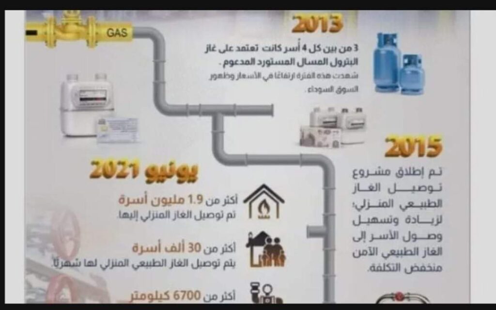 تتوسع جهود الإدارة المصرية في توصيل الغاز، حيث أن أكثر من 1.9 مليون أسرة تم توصيل الغاز الطبيعي المنزلي إليها في 2021، مقارنةً بالوضع في 2013؛ حيث كانت 3 أسر من بين كل 4 أُسر تعتمد على غاز البترول المسال المستورد المدعوم من الحكومة، ومن المخطط أن يبلغ عدد الأسر التى يصل الغاز الطبيعي لمنازلهم إلى حوالي 2.3 مليون أسرة بنهاية 30 يونيو 2022.