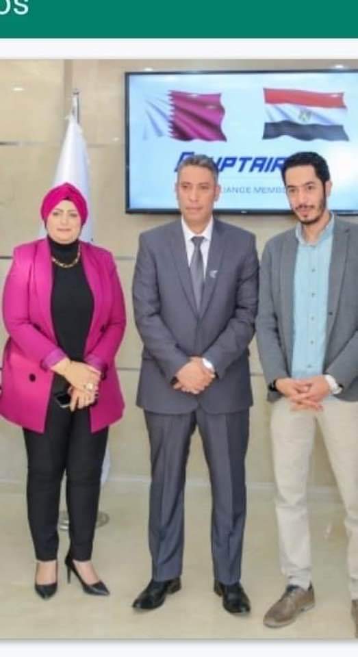 ووائل الدمرداش رئيس القطاع التجاري بشركة مصرللطيران للخطوط الجوية وريم عرابي رئيس قطاع التحالفات والعلاقات الدولية بمصرللطيران ومدحت ابوالمجد مدير مكتب مصرللطيران بالدوحة .