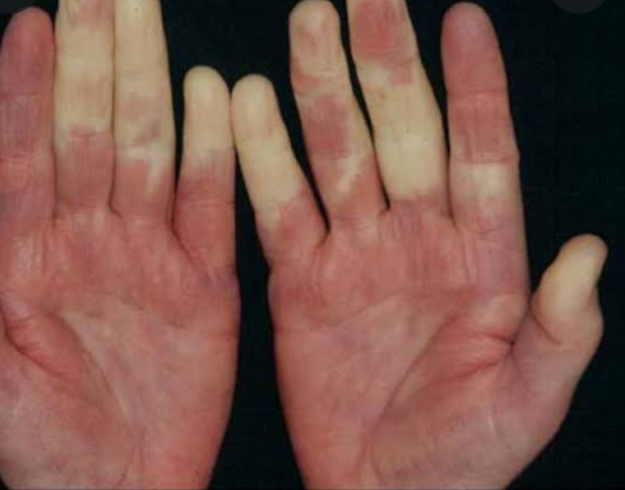 ADVERTISEMENT و في البداية تظهر الأطراف المتأثرة بلون أبيض ثم تتحول للون الأزرق مصحوباً بإحساس البرودة و التنميل وتقل حاسة اللمس في هذه الأماكن و عندما تتحسن الدورة الدموية تبدأ هذه الأماكن في الاحمرار ، التورم أو الإحساس باللسع و هذه الأحداث ليس شرطاً أن تحدث بهذا الوصف والترتيب في كل الأشخاص .
