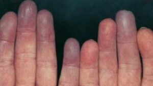 و من أهم أسبابه : مرض تصلب الجلد (Scleroderma) و هو مرض نادر يؤدي لزيادة سمك الجلد و معظم المصابون به يصابون أيضاً بـ مرض رينود و مرض الذئبة الحمراء و هو مرض مناعي، و التهاب المفاصل (Sjogren’s syndrome).