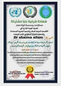 تكريمآ لجهودها وتقديرآ ووفاء لإسهاماتها الكريمة والجليلة والمتميزة منحت الأعلامية د شيماء علام شهادة شرفية عليا مشتركة من الأكاديمية الدولية للسلام والتمنية البشرية المستدامة و المنظمة الدولية لمتطوعي الأمم المتحدة إقرارآ وتقديرآ لأعمالها الأنسانية فى نشر المحبة والتائخى والسلام .